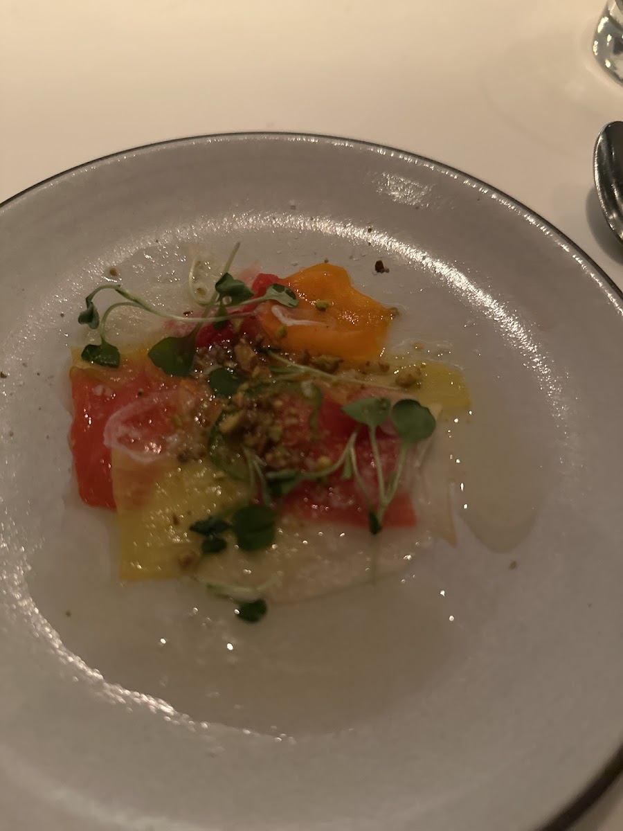 Beautiful restaurant. Dark and moody. Perfect for a late dinner or date night. Grab a reservation in advance as it's busy all night, even saw people seated at 10:30pm when we were leaving. Service was fantastic. Very attentive. Extremely knowledgeable about the menu and ingredients. They do a great job at pacing the courses so you don't feel rushed or wait long periods between each. The food was hit and miss for me. The tomato course with tomato donut, smoked feta, and jam was a real standout, as it had a nice balance of flavors. The eggplant "corn dog" in curry was also a fun take on an American classic, although the entire thing fell apart as soon as you started eating. Unfortunately, the lettuce and corn courses felt pretty uninspired - a lot of ingredients mixed to be a very expected taste. Two pet peeves for this spot. They will not seat you until your entire party arrives, so you're left sitting by the door instead moving to your open table and having a drink and settling in. There are two restrooms in the corner that 1) require you to stand in the service walkway and you will probably get scolded by a server for not being against the wall 2) results in standing in line for 10 minutes in some cases.